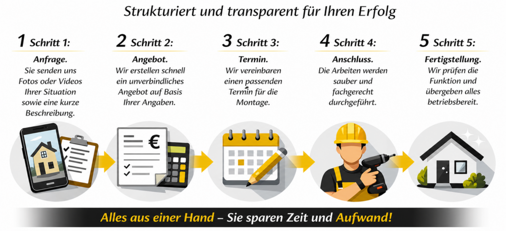 Wir arbeiten sorgfältig und zuverlässig und verwenden ausschließlich geprüfte Materialien und Komponenten. Unsere Arbeiten erfolgen mit Fokus auf Sicherheit, Sauberkeit und Funktion.
